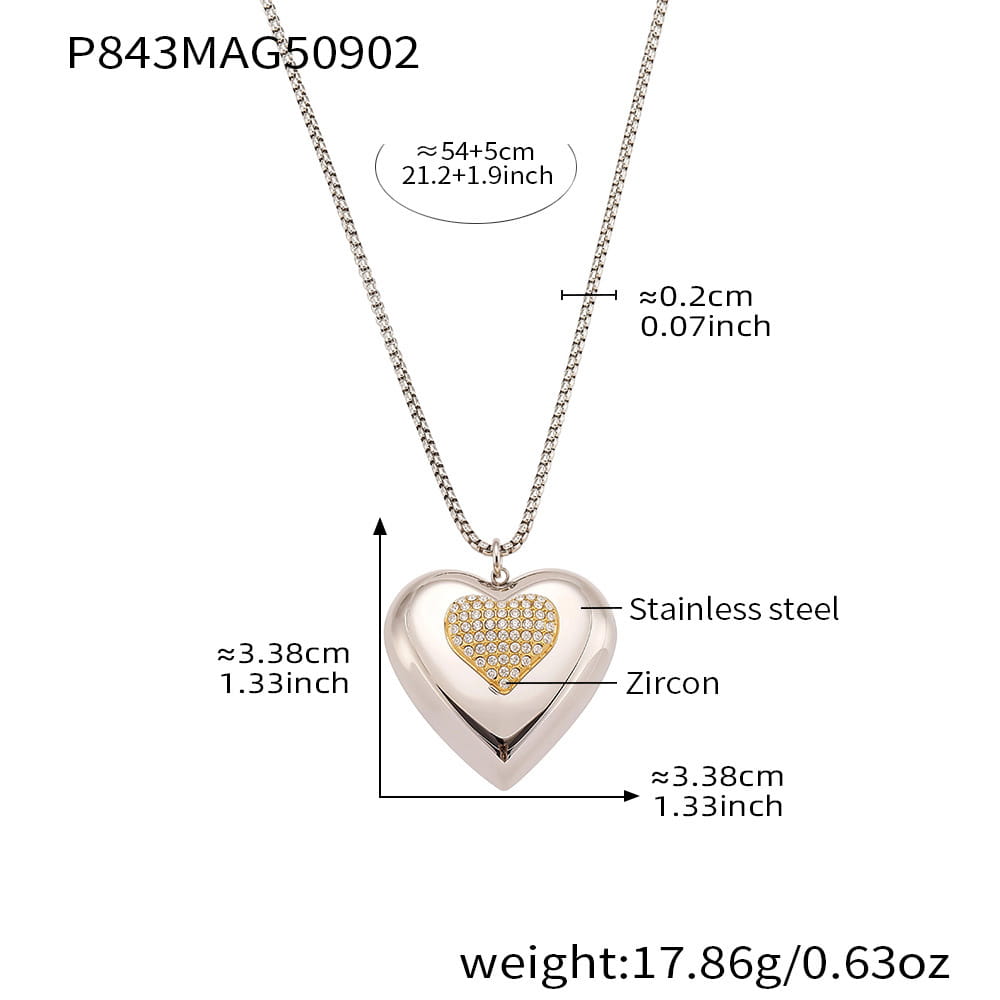 Heavy Duty Two Tone Heart Shaped Zircon Clavicle Necklace is a bold yet elegant piece that represents love, balance, and resilience. Featuring a two-tone heart pendant inlaid with zircon stones, this stainless steel necklace is waterproof, hypoallergenic, and designed to resist fading—making it a lasting treasure for women who value both beauty and durability.